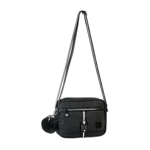 Características do produto: - confeccionada em crinkle com efeito brilhoso. - rb na cor preta - chaveiro de pompom e mosquetão de estrela. - alça acetinada listrada com glitter. - zíper tratorado. - com dois bolsos. - forro rosa personalizado.