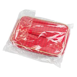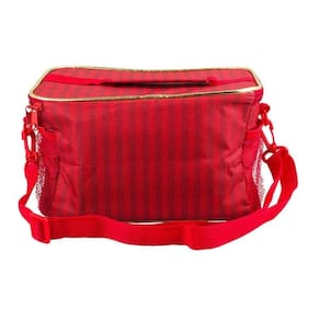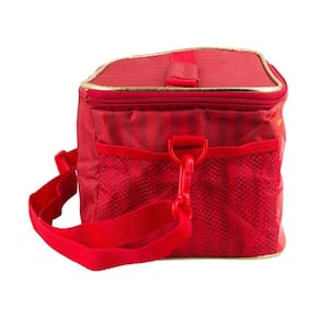 Bolsa vermelha do tipo Lancheira que é térmica com 15 x 27 x 18 cm de dimensão, estampa com imagem do Mickey. Interior revestido de alumínio, fechamento a zíper. Duas bolsas laterais sem zíper. Alça removível. Material: 600D e PVC