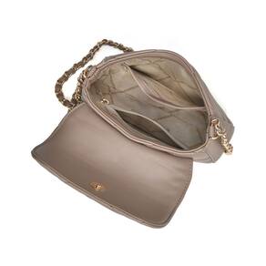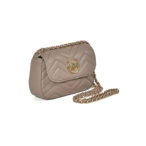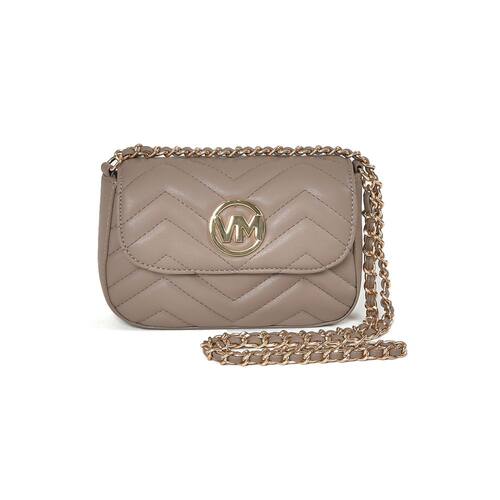 Bolsa Crossbody mini em PU com detalhes em matelassê geométrico. Design retangular com bordas arredondadas e alça de corrente fixa. Fechamento com tampa e botão magnético. Inclui bolso interno no forro, ideal para itens pequenos. Perfeita para adicionar elegância a qualquer look. Placa frontal VM de metal circular.
