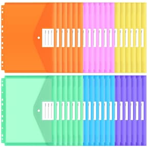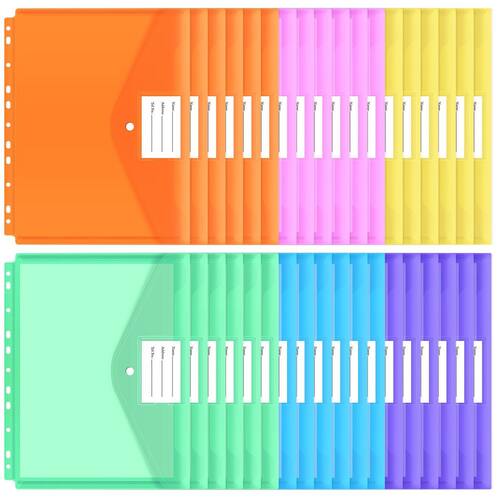 Especificações do produto Número de produtos: 30 peças no total por grupo. Cor do produto: azul*5, roxo*5, amarelo*5, rosa *5, laranja*5, verde*5 Tamanho do produto: tamanho do envelope, 29,5 x 24,5 cm, maior espaço de armazenamento Características do produto: feito de plástico PP de alta qualidade, durável, resistente ao desgaste e à prova d'água. Desta forma, você não precisa se preocupar com acidentes como chuva ou derrubar copos de água. O design do bolso da etiqueta permite que você marque como quiser. Garantia de serviço: se você tiver alguma dúvida sobre nossos cadernos ou estiver interessado em algum produto da marca EOOUT você pode entrar em contato conosco a qualquer momento e responderemos dentro de 24 horas. desejo-lhe uma vida feliz. - O produto inclui: 30 bolsos para fichário em 6 cores. - Tamanho do produto: 11,6 x 9,64 polegadas (29,5 x 24,5 cm), tamanho de envelope de carta padrão. Desta vez, atualizamos o tamanho da pasta de fichário da EOOUT, a largura aumentou em 11%, comporta até 50 folhas de papel, atende às suas necessidades de grande capacidade. - Material bruto de qualidade premium: a bolsa para fichário da EOOUT é feita de material bruto de PP de qualidade premium, com cor pura, resistente e à prova d'água e protege efetivamente todos os seus objetos. - Design detalhado: esta pasta tem um design de 11 furos, adequado para a maioria dos fichários e se adapta aos hábitos americanos. Adicionamos um bolso de etiqueta à capa de encaixe, você pode adicionar uma marca ao usá-la, para que possa visualizar e encontrar rapidamente o conteúdo. - Várias aplicações: nossas sacolas plásticas são fáceis de transportar e podem manter seus pertences em ordem. Eles podem ser utilizados para armazenar contas, documentos, papéis, etc. Também pode ser utilizado para armazenar artigos de papelaria, viagens, etc.