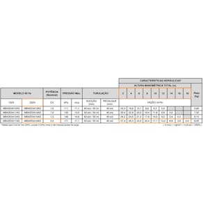 Especificações Sucção 50mm int e 60mm ext / recalque 40mm ext Potencia: 1cv Corrente: 5,5A Pressão Máxima 13,50 mca Vazão máxima 25,4 m³/h Voltagem: 220V Autoescorvantes: Não