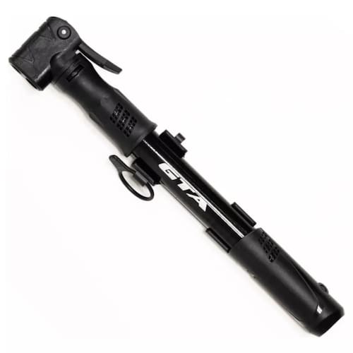 Modelo: Mini com Mangueira Bico: Cabeça Dupla - Presta (Fina) e Schareder (Grossa) Corpo e Haste: Alumínio Possui cabo em "T" para maior ergonomia e sistema de mangueira giratória para facilitar a calibragem Manômetro: Não possui Pressão de Calibragem: 80 PSI Comprimento: 27,5cm Acompanha Suporte de Fixação na Bike: Sim Cor: Preto Peso Aprox.: 130g Marca: GTA
