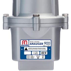 Bomba Submersa Vibratória para PoçoBomba para poço com diâmetro igual ou superior a 8 polegadas 200 mm Anauger 900: Maior vazão da linha anauger. Possui saída de 1 polegada, o que reduz o atrito na mangueira condição ideal para vazões que a bomba proporciona. Excelente rendimento com maior vazão e possibilidade de atender as necessidades de água para uma residênciaUtilizada no abastecimento doméstico, para pequenas irrigações e criação de animais.Vazão máxima: 2.300 litros/horaAltura manométrica máxima: 65m elevação Temperatura máxima da água: +35 CProfundidade de utilização abaixo do nível da água, submersão máxima: 20mBombeamento de água limpaTensões: 220V Frequência: 60HzPotência 450 WattsElevação máxima 65 metros