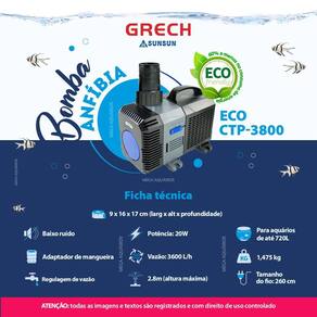 Especificações: Marca: Grech Modelo: ECO CTP-3800 Potência: 20W Vazão: 3.600 L/h Hmax: 2.8m Tamanho: 9 x 16 x 17 larg x alt x profundidade Para aquários / lagos de até 720 litros Tamanho do fio: 260cm Peso: 1.475 kg