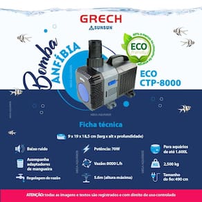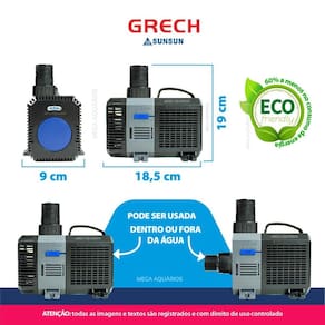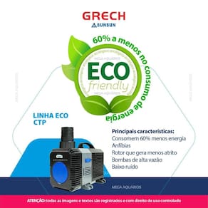 As bombas da linha Grech Eco CTP de alta vazão para aquários e lagos são anfíbias, ou seja, podem ser utilizadas dentro ou fora da água e possuem tecnologia exclusiva que chega a consumir cerca de 60% a menos de energia elétrica.