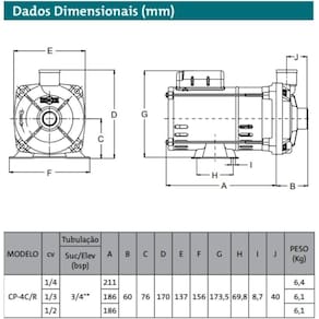 Bomba Centrífuga 1/3CV Monofásica 110/220V CP4R DANCOR