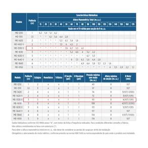 Especificações Técnicas: Modelo: ME-BR 1530V Potência: 3 CV Tensão: 220/380V Fase: Trifásico Número Estagios: 5 Diânetro Sucção:1 Polegada Diâmetro Recalque: 1 Polegada Diâmetro Rotor: 4 (107mm) 1 (91mm) Pressão Máxima sem Vazão: 93 m.c.a. Altura Máxima de sucção: 8 m.c.a. Bocais com rosca BSP Rotor fechado de Bronze - Selo Viton Eixo de aço inox AISI-420 Selo mecânico constituído de aço inox AISI-304, buna N, grafite e cerâmica (ME-AL) e Viton, grafite e cerâmica (ME-BR) Lateral de entrada, divisão, corpo de saída e intermediário de ferro fundido Motor elétrico IP-21, 2 polos, 60 Hz (até 3 cv)