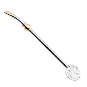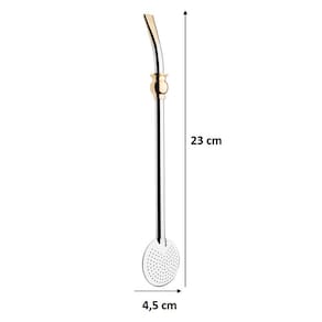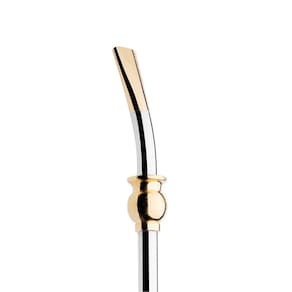 Bomba para chimarrão em aço niquelado com banho de cromo, com um delicado anel em formato de cuia no centro do cano, com banho de ouro. Uma peça para agregar originalidade ao seu chimarrão.