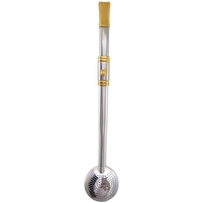 Tradição e qualidade para o seu mate ficar mais saboroso! Banhada a ouro 18K ela possui a rosca desmontável para após de encerrada a roda de chimarrão, fazer aquela limpeza da bomba, nesse momento você só precisa desenroscar o bojo e lavar com água corrente e usar a escovinha de auxilio para a limpeza. Pode ser usada para chimarrão, mate ou terere. Com pingentes variados aposte nesta bomba para compor sua cuia.