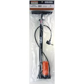 Bomba manual com mangueira e bico para pneus de bicicleta com reservatório. Corpo em aço, reservatório e bico em aço laminado, base em ferro fundido, mangueira e alça em polipropileno. Medidas: 590mm de altura e 32mm de diâmetro.
