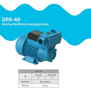 A Bomba Periférica Autoaspirante DPA-40 é compacta, tem um baixo nível de ruído e é ideal para transferência de água limpa e isenta de sólidos para cisternas, reservatórios e no abastecimento de residências, indústrias de pequeno porte e pequenas irrigações.