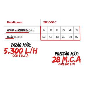 - Motor: Monofásico - Típo do Motor: Elétrico - Indução - Potência do Motor: 1,0 cv (0,73 kW) - Rotação do Motor: 3500 rpm - Altura manométrica máxima: 28 M.C.A. - Tipo de rotor: Latão - Sucção máxima:8 m - Vazão Máxima5,4 m3/h