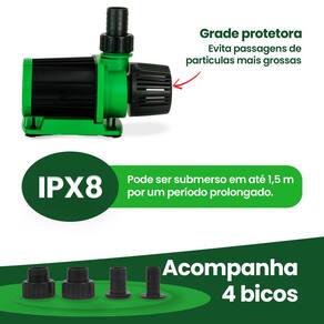 A estrutura da bomba conta com proteção IPX8, o que garante funcionamento submerso seguro em até 1,5 metro de profundidade por períodos prolongados. Sua altura máxima de elevação de 5 metros permite uso em instalações verticais ou com desníveis. A grade de proteção inteligente impede a entrada de partículas maiores, protegendo o motor e aumentando sua durabilidade, enquanto as ventosas de ultra fixação asseguram estabilidade e segurança na instalação.