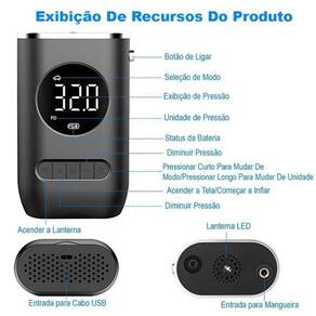 Função Lanterna: Além de inflar pneus e bolas, o compressor conta com uma lanterna embutida, ideal para auxiliar em locais escuros ou situações de baixa visibilidade.