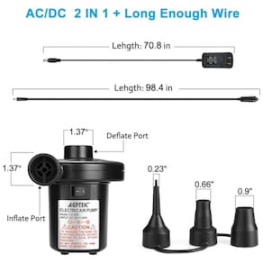 Poderosa bomba de ar elétrica As bombas de ar AGPtek são tão poderosas que podem não apenas inflar itens, mas também desinflar produtos sugando o ar O adaptador de energia do carro e o adaptador de energia doméstica estão incluídos, possibilitando o uso interno e externo. NOTA Esta bomba de ar NÃO é recarregável e NÃO É PARA BALÕES 3 bicos para escolher Temos 3 bicos de tamanhos diferentes nas bombas elétricas de colchão de ar S, M e L, permitindo que você infle, desinfle itens diferentes em qualquer ocasião Dica Não aplicável ao Intex Challenger K1 Fácil de usar A bomba de colchão inflável é compatível com fonte de alimentação de 12 V CC e 110 120 V CA. Para inflável, basta colocar a cabeça inflável no porão de enchimento e pressionar o botão. Para esvaziar, você deve colocar a cabeça inflável no orifício de ventilação e pressionar o botão para desinflar. Nossas bombas de colchão de ar elétricas são simples de operar. Portátil A bomba de colchão inflável é pequena e leve, tornando a conveniente para uso interno e externo. Em uma dimensão amigável para viagens, você pode facilmente levar as bombas de ar para qualquer lugar Multifuncional incluindo adaptador de energia para carro e adaptador de energia para casa. Esta bomba de colchão inflável é um poderoso inflador e desinflador para uso interno e externo, especialmente para viagens e atividades ao ar livre. O que você recebe 1 bomba elétrica e 3 bicos de tamanhos diferentes Marca: Não Informado