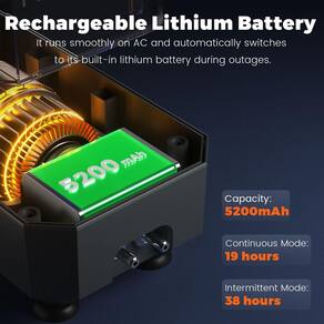 -?Não se preocupe com cortes de energia?Para cortes de energia, a bomba de ar do aquário continua fornecendo oxigênio aos peixes para evitar a morte. A bateria de lítio de 5200mAh está equipada para a bomba de ar recarregável. Se ocorrer um corte de energia, ele muda para o modo DC alimentado por bateria a partir da alimentação AC para operação por até 19 horas. O modo intermitente é de até 38 horas, o que o torna a escolha perfeita para tanques de peixes, lagoas, movimentação de peixes ou pesca ao ar livre.