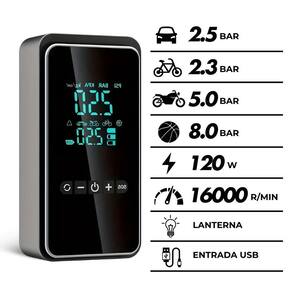 - Display Digital: Monitora a pressão com precisão, garantindo inflação correta para cada tipo de pneu ou equipamento.
