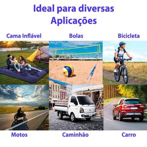 Inflador portátil para pneus de carro, moto, bicicleta, caminhão e objetos infláveis pequenos (bolas, boias, camas infláveis, brinquedos). Possui função medidor de pressão e lanterna com três modos de iluminação.