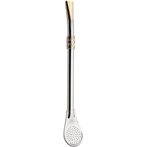 Desfrute seu chimarrão com qualidade, sabor e tradição! #Peça Inteira #Bojo Pêra #19cm Garantia: 90 dias / Peso: 030g/ Cor: Prata e Dourado/ Ref: 111 Dimensões: 2cm(C) x 1cm(L) x 19cm(A) Cuidados: Não lavar com materiais abrasivos. Após o uso lavar com esponja macia e sabão neutro, guardar o produto seco. Bomba: Sem Rosca. Material: - Ferro: Material de alta durabilidade, com excelente camada de protetivo, não perde suas propriedades. Bomba de qualidade medindo 19cm de altura, fabricada em ferro, possui bocal dourado, dando aquela nobreza na bomba. Cano com anel trabalhado em dourado vai compor perfeitamente com sua cuia. Bojo em formato de pera é indicada para mate, mas pode ser usada para Tereré e Chimarrão.