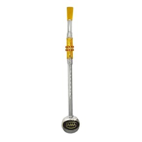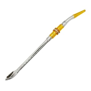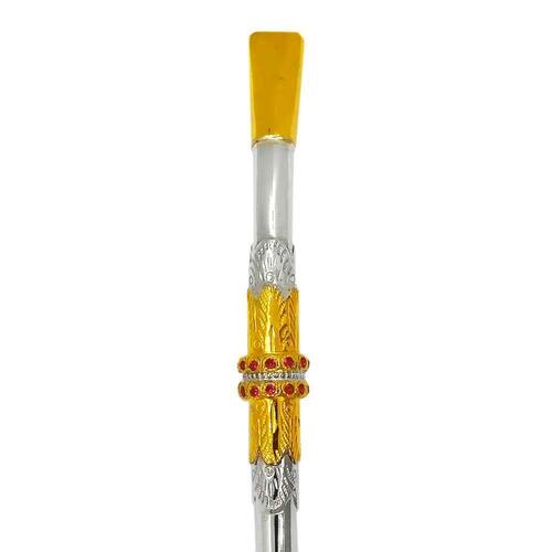 Cano: Redondo, curvado Diâmetro: 9,5 mm Comprimento: 28 cm Material: Prata 600 e ouro 12k chapeado Descrição: Folhas e um anel central redondo de ouro e com vinte e dois rubis.