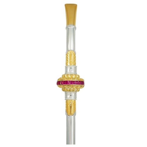 Cano: Redondo, curvado Diâmetro: 9,5 mm Comprimento: 28 cm Material: Prata 600 e ouro 12k chapeado Descrição: Folhas e anel central de ouro circundado com 22 rubis.