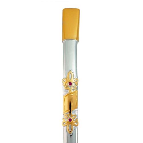 Descrição: Cano liso, detalhe com duas flores de lis, com rubis e no meio uma chapinha em ouro, Com bojo rosqueável.