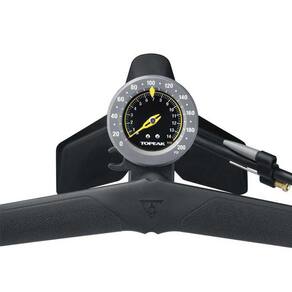 Base estável com três pés largos e corpo em aço para mais resistência. Capacidade de pressão de 200 psi / 14 bar, possibilitando calibrar pneus de bicicletas MTB ou Speed.