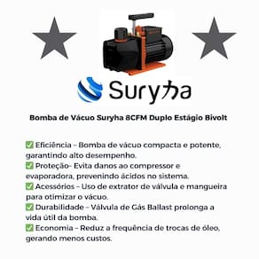 A Bomba de Vácuo 8CFM Duplo Estágio Suryha é ideal para realização de vácuo em sistemas de refrigeração e ar condicionado. Com design inovador, é compacta e extremamente potente, contando com dois estágios para atingir um vácuo mais rápido e profundo. Sua função é evitar que gases e umidade presentes no sistema causem danos ao compressor e evaporadora. A mistura de fluido refrigerante com água gera um composto ácido capaz de oxidar todas as partes metálicas internas do sistema, obstruindo os capilares.