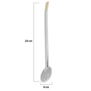 Bomba para chimarrão e tereré Garibaldi fabricada em ferro, possui cano chato, bojo redondo e biqueira com pintura dourada.