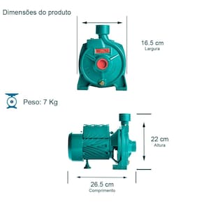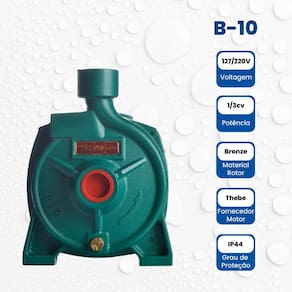 Abastecimento de reservatórios/caixas d'água, cisternas, pressurização de jardins, uso em irrigações, transferência de água para reservatórios, chácaras, abastecimento de bebedouros, circulação, filtragens, máquinas operatrizes, Fornos de Indução. Acompanha bóia elétrica: Não Acompanha válvula de retenção: Não Altura: 22 cm Altura manométrica total: 18 mca Ambiente Principal: Jardim e Varanda Composição: Carcaça em ferro fundido. Rotor em bronze. Ponta do eixo em aço inox (evita corrosão prematura). Anel O'ring de vedação da carcaça em VITON. Selo mecânico: Faces em grafite e cerâmica. Mola em inox 304 e elastômero (borracha) em VITON. Comprimento: 26,5 cm Conexão de entrada/saída: Sucção 1" x Recalque 1" Ergonômico: Não Funcionamento: Elétrica Itens Inclusos: 1 Bomba de Água Largura: 16,5 cm Manual de Montagem e Instalação: https://product-hub-prd.madeiramadeira.com.br/982166/documents/aee318ea-b4ab-4aff-b144-ef0faa99b9fb32237124578317239288380905.pdf Marca: EBARA Material Principal: Ferro Fundido Modelo: Bomba Monoestágio B-10 1/3 Cv Monofásico Motor Thebe Ip44 127/220v Necessita Montagem: Não Origem do Produto: Nacional Peso: 7 kg Potência do motor: 0,33 HP Profundidade de sucção: 4 m Recomendações de Uso, Manutenção e Limpeza: Verifique nosso manual de Manutenção Rotação do motor: 3.500 rpm Temperatura Máxima da Água: 70 °C Tipo de Água: Água Limpa Tipo de bomba de água: Centrífuga Vazão máxima: 5.300 L/h Voltagem: Bivolt