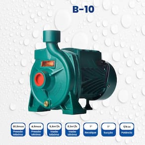 Abastecimento De Reservatórios/caixas D'água, Cisternas, Pressurização De Jardins, Uso Em Irrigações, Transferência De áGua Para Reservatórios, Chácaras, Abastecimento De Bebedouros, Circulação, Filtragens, Máquinas Operatrizes, Fornos De Indução Acompanha bóia elétrica: Não Acompanha válvula de retenção: Não Altura: 22 cm Altura manométrica total: 14 mca Ambiente Principal: Jardim e Varanda Composição: Carcaça em ferro fundido. Rotor em bronze. Ponta do eixo em aço inox (evita corrosão prematura). Anel O'ring de vedação da carcaça em Buna N. Selo mecânico: Faces em grafite e cerâmica. Mola em inox 304 e elastômero (borracha) em Buna N. Comprimento: 26,5 cm Conexão de entrada/saída: Sucção 1" x Recalque 1" Consumo de energia aproximado: 500 kW/h Ergonômico: Não Funcionamento: Elétrica Itens Inclusos: Bomba Monoestágio B-10 1/4 Cv Monofásico Motor Thebe Ip44 127/220v Largura: 16,5 cm Manual de Montagem e Instalação: https://product-hub-prd.madeiramadeira.com.br/968466/documents/4df2bccb-8324-4eb0-ac2b-c683bb7ef70532237124578317239288380905.pdf Marca: EBARA Material Principal: Ferro Fundido Modelo: BOMBA MONOESTÁGIO B-10 1/4 cv MONOFÁSICO MOTOR THEBE IP44 127/220V Necessita Montagem: Não Origem do Produto: Nacional Peso: 7,2 kg Potência do motor: 0,25 HP Profundidade de sucção: 4 m Recomendações de Uso, Manutenção e Limpeza: Verifique nosso manual de Manutenção Rotação do motor: 3.500 rpm Temperatura Máxima da Água: 70 °C Tipo de Água: Agua Limpa Tipo de bomba de água: Centrífuga Vazão máxima: 5.500 L/h Voltagem: Bivolt