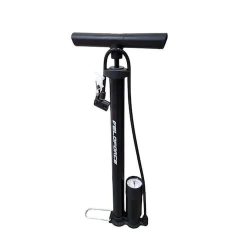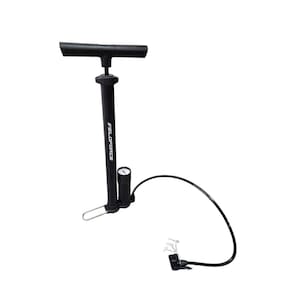 Bico: reversível presta e schrader. Barril: aço Estrutura externa: nylon Manômetro: manometro analógico Estrutura para apoio dos pés com mini reservatório Pressão de calibragem: 100 psi Tubo em 3 polegadas com 59 cm de altura.