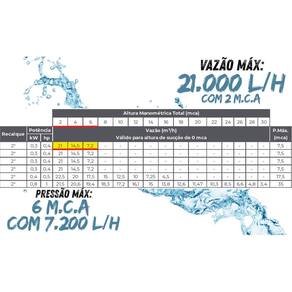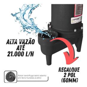 Características Potência: 0,4 CV Tensão: 220 V Sucção (entrada) Recalque (saída): 2 pol. Vazão máxima: 21.000 Litros por hora Vazão mínima: 2.400 Litros por hora Polaridade: Alta rotação Carcaça: Ferro fundido Enrolamento do motor: Cobre Rotor: Ferro fundido Temperatura máxima do líquido: 40 °C Informações Técnicas Adicionais Modelo desenvolvido para operação submersa Estrutura compatível com utilização em ambientes com presença de partículas sólidas em suspensão Garantia Garantia de 24 meses do fabricante contra defeitos de fabricação. Dimensões do Produto Peso: 17 kg Comprimento: 21 cm Largura: 30 cm Altura: 45 cm Orientações A instalação deve ser realizada por profissional qualificado.