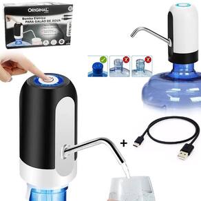 Bomba elétrica automática recarregável USB para galão de água. Tamanho 11 x 6cm. Material plástico e aço inox. Desligamento automático.Água gelada