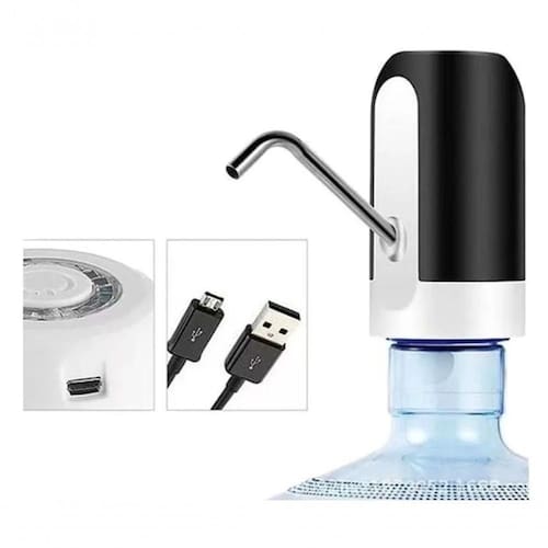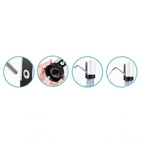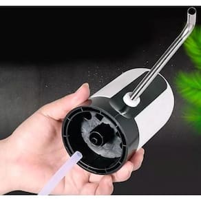Bomba elétrica recarregável para galão de água, compatível com galões de 5l, 10l, 20l e similares. Possui bateria de longa duração, vazão de 1 litro em 35 segundos, e é feita de materiais seguros como aço inox 304 e silicone.Água gelada