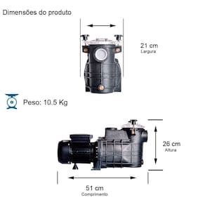 Motobomba Centrífuga com Pré-Filtro Transparente para Piscina Monoestágio - Monobloco - Motor Monofásico IP-44 Bivolt com seletor de voltagem em II Polos, 60Hz, 3500rpm - Bocais com rosca BSP, Sucção 1.1/2" x Recalque 1.1/2". Utilizada para água limpa até temperatura de 60ºC. Carcaça, rotor e tampa traseira em termoplástico. Ponta do eixo em aço inox (evita corrosão prematura). Bocais de rosca com inserto de latão. Facilidade de limpeza do pré-filtro devido aos "Knobes" laterais localizados na tampa. Anel O'ring de vedação da carcaça em Buna N. Selo mecânico: Faces em grafite e cerâmica. Mola em inox 304 e elastômero (borracha) em Buna N.