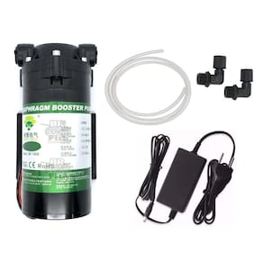 Bomba pressurizadora para purificadores de osmose reversa, ideal para pressão hidráulica inferior a 2,5 kgf/cm2. Inclui fonte bivolt e conectores.