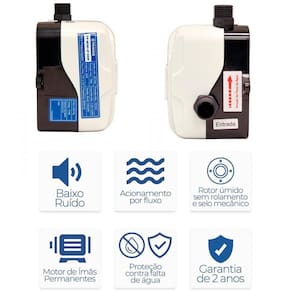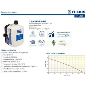 Minibomba pressurizadora de água automática com ímãs permanentes - 80 watts tp-mini-ip 110/220v texiusdescrição:a mini bomba de água tp-mini-ip 80w texius é compacta, eficiente e extremamente fácil de instalar em pias, aquecedores, máquinas de lavar roupa e até mesmo em motorhomes. Possui motor de ímãs permanentes de alta eficiência que garantem uma economia de energia de até 60%. Além disso, sua instalação é simples, podendo ser concluída em minutos.Esta mini bomba é a solução prática e versátil para pressurizar água onde você quiser. Ela foi projetada para operar silenciosamente, garantindo a sua tranquilidade no uso enquanto desfruta do conforto proporcionado pela água.Características e detalhes técnicos:cor: branco.Marca: texius.Modelo: tp-mini-ip 80w.Tensão: 110/220v bivolt .Potência: 80w equivale a 120w das bombas comuns .Material do corpo: plástico de engenharia.Motor com proteção: ip 44.Temperatura ambiente local instalação : 0c a 40ºc.Pressão máx. Na sucção: 40 mca.Temperatura de operação: 5 a 60c.Vazão mínima para acionamento: 1,2 l/min.Tipo de instalação: de parede.Conteúdo da embalagem: 1un motobomba centrifuga tp-mini-ip 80w 110/220v 50/60hz motor ímãs permanentes + 1un união rosqueável + 1un fonte dc + 1un flexível de água de 1/2 polegada.Dimensões do produto somente bomba : 12x09x14 cm.Peso líquido conjunto montado : 0,955 kg.Garantia de fábrica: 2 anos.Aplicação e porque escolher esse modelo:- baixo nível de ruído.- acionamento por fluxo.- rotor úmido sem rolamento e selo mecânico.- proteção contra funcionamento a seco.- fixação direta no aquecedor.- leve, compacto e de fácil instalação.- 60% de economia de energia em relação a motores convencionais.- para torneiras gourmet, motorhomes e aquecedores de passagem.Atençãoeste produto é um mini pressurizador de água, não faz aquecimento.Uma bomba completa e silenciosa para deixar seu banho perfeito não perca essa oportunidade, adquira o seu agora