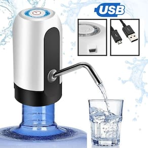 Prático e simples de beber água, podendo ser levado para qualquer lugar e ser utilizado em qualquer galão. Recarregável através de fontes de celular, bivolt.