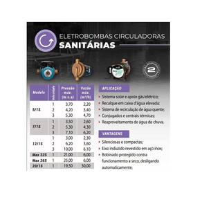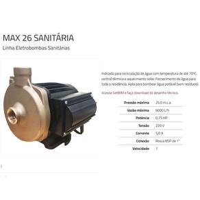 Bomba Rowa MAX 26 SANITáRIA 220V – Recirculação AquecedorCaracterísticas Técnicas PrincipaisPressão máxima: 25,5 mcaVazão máxima: 6,5 m³/hTensão: 220 V Potenica: 0,75 HPCorrente: 5,9 AConexao: 1" BSPTemperatura máxima: 70oC e picos de 90oCCorpo de bronze Protetor térmico incorporado Suporta uma Pressão máxima do sistema de 10 kgf/cm²Vantagens/Benefícios Ideal para recirculação de sistema solar, conjugados, retorno de água quente e centrais térmicas. Proteção contra funcionamento a seco.Produzida com materiais inoxidáveis. Totalmente silencioso e 2 anos de garantiaDimensão do ProdutoComprimento: 24 cmLargura: 22 cmAltura: 22 cmPeso: 5,40 kgAplicação Eletrobomba de recirculação para água fria e quente de sistemas solares, centrais térmicas, retorno de água quente e conjugados.De 2 a 4 Aquecedores0017-0006 Bomba Rowa MAX 26 Sanitária 220V – Recirculação Aquecedor