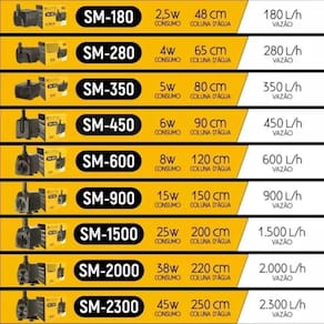 Bomba sub soma aquarios sm- 600 600 l/h 127v descrição nova linha de bombas submersíveis soma. Modelo sm-600 110v Com 8 watts de potência Vazão de 600l/h Controlador de fluxo e coluna d'água de 120 centímetros. Acompanha ventosa de fixação, tubo de saída e cabo de 1,40 metros.