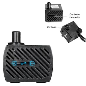 Principais Características: - Motor bomba submersa para aquário, fontes e bebedouros pet - Potência de 3W - Voltagem 220V - Frequência de 50/60Hz - Elevação máxima de 4cm - Vazão máxima de 180 l/h - Nível de proteção IP-X8 - Fácil instalação e manutenção - Design compacto e leve - Resistente à abrasão - Controle de vazão de água - Ventosas de alta resistência para fixação discreta - Material em plástico ABS e componentes eletrônicos