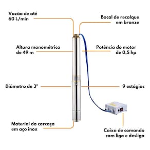 Ela tem diâmetro de 3, mais especificamente 76,2, o que permite que ela possa ser instalada em tubos de 100 mm. Seu motor de 0,5 hp, 9 estágios e recalque de 1 que proporcionam uma vazão máxima superior a 60 litros por minuto, atingindo uma altura manométrica máxima de 50 m.c.a.. Ela oferece melhor desempenho que as bombas injetoras com economia de energia.