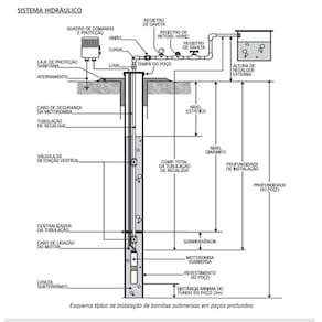 - Potência do motor: 1500W/ 2CV - Voltagem: 220V - Altura Manométrica: 101 mca - Vazão máxima: 5 L/h - Recalque de sucção: 1 - Cabo elétrico: 2 M - Cabo Plugue : 1 ponto - Profundidade de Instalação: 3 Metros