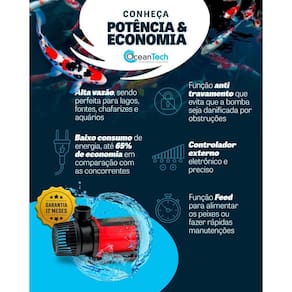 Principais Características - Bomba ECO com baixo consumo de energia, economia superior a até 65% em relação às bombas concorrentes. - Apresenta trava de segurança no rotor sistema de segurança contra funcionamento a seco, em caso de falta de água . Com chip inteligente que desliga a bomba em caso de falta de água. - Contém moderno controlador externo que permite ajuste da vazão e função de pausar o funcionamento por 5 minutos, para limpeza ou alimentação dos peixes. - Elevado desempenho com grande fluxo de água e coluna dÁgua. - Equipamento monofásico com modelos 110v e 220v. - Equipamento apresenta corrente alternada e não pode ser ligado em NoBreak. Obs.: Apesar do modelo AC não ser compatível com Nobreak, também forcemos o modelo DC bivolt, com corrente contínua e compatível com NoBreak. - Bomba de funcionamento silencioso. - Eixo cerâmico ante corrosão, não enferruja e permite longa vida útil ao equipamento. - Perfeita para lagos, fontes, chafarizes, sumps de aquário, entre outras aplicações. - Diferentes tamanhos de conexões, flexibilidade para diferentes diâmetros de mangueiras e tubulações. - Comprimento da fiação adequado para instalações distantes: comprimento do cabo de energia de 2,5m e do cabo do controlador 1,4m. - Pode ser tanto em aquários de água doce como também de água salgada, por não conter nenhum elemento de cobre. - Equipamento de fácil manutenção, não é necessário nenhum uso de ferramentas especiais para desmontar, mais fácil de limpar e fazer manutenções preventivas. Descrição Toda a linha AC PUMP Ocean Tech se destaca pela economia de energia e pelas quatros funcionalidades que são extremamente úteis: A primeira é o controle eletrônico de vazão. Muitas pessoas ficam na dúvida sobre a vazão ideal, a vazão que o seu sistema suporta e a possibilidade de ampliação futura dos seus projetos. Com essa regulagem você pode usar uma bomba mais forte do que o necessário para o momento e regular a vazão ideal através do controlador eletrônico,com o simples apertar de 1 botão, dispensando a necessidade de registros que Estrangulam A bomba, fazendo com que ela trabalhe sobrecarregada. A segunda é o botão Feed. Quando pressionado ele interrompe o funcionamento da bomba por 5 minutos. Tempo suficiente para realizar pequenas manutenções no seu filtro ao alimentar os peixes sem que a comida seja sugada para o filtro. A terceira é uma das mais importantes, a função anti travamento. Caso algo grande bloqueie a rotação do impeller, esgotadas as tentativas de destravamento,o controlador interrompe o funcionamento, evitando que o seu equipamento seja danificado. A quarta também é uma função de segurança, a função anti secamento. No caso de secamento do compartimento onde a bomba está instalada, após algumas tentativas de normalização do sistema, o controlador desativa o funcionamento, garantindo que o equipamento não exceda sua rotação máxima, superaqueça e seja permanentemente danificado. Recomendações Se a tomada estiver abaixo do nível da bomba, faça uma curva no cabo conforme imagem abaixo para prevenir que a água escorra pelo o cabo e molhe a tomada ocasionando um curto circuito. Cuidados Desligar a bomba antes de manusear; Não ligar a bomba fora da água; Não levantar a bomba pelo fio, isso evita o rompimento do cabo interno; Não usar em líquidos quentes acima de 40º ; Manter totalmente submersa quando em operação; A bomba desligará dentro de 2 minutos em caso de falta de água por 2 minutos. Informações Técnicas Verifique abaixo todas informações de sua nova bomba submersa: Modelo: AC-20000 Potência: 200W Vazão: 20.000l/h Coluna D'água: 7m Conexões: 2025303540mm Dimensões CxLxA : 30x13x16cm Cabo Energia: 2,5m Cabo Controlador: 1,4m