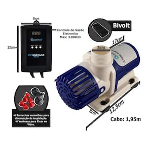 Especificações técnicas da Bomba OtPrime 3000L/h: Vazão máxima: 3000 L/h Altura máxima: 3m Consumo máximo: 35W Voltagem: bivolt (110V ou 200V) Tamanho: (LxAxP) 8x16x17cm Peso da bomba: 775g Peso total: 1.600Kg Saída de água: 20 ou 25mm Tamanho do fio até o controle: 150 cm Tamanho do fio do controle até a tomada: 300cm