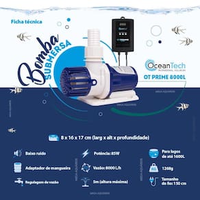 Bomba submersa OceanTech OT Prime Sine Wave com fluxo constante para aquário de água doce ou criação de ondas para aquário marinho - 8000 L/h - 85W A bomba OT Prime da Ocean Tech é o que tem de mais moderno no mercado e com a nova tecnologia Sine Wave, ela proporciona um maior controle de fluxo e vazão, adequando de acordo com a necessidade de cada aquário, seja de água doce ou salgada. Além do modo fluxo constante de água, ela tem dois modos de criação de ondas. Tudo isso com 3 anos de . LANÇAMENTO OCEANTECH 2021 Características: Nova tecnologia Sine Wave OceanTech Controle de vazão externo com 20 níveis de potência Possui 4 modos de fluxos A potência de saída pode ser ajustada para atender diferentes tamanhos de aquários A bomba pode ser utilizada para circulação e recalque de água e produção de ondas Com inversor DC trifásico inteligente de seis polos Baixa tenção de operação DC 24v Pode ser ligada nas tensões 110V e 220V Com eixo de cerâmica e mancal do eixo de fibra de carbono o que garante maior durabilidade Pode ser utilizada em água doce e salgada Manual em português Compacta Econômica Silenciosa Segura Especificações técnicas: Vazão máxima: 8000 L/h Altura máxima: 5m Consumo mínimo: 10W Consumo máximo: 85W Voltagem: bivolt 110V ou 200V Tamanho: 8x16x17 cm larg x alt x profund Peso só da bomba: 1.268g Peso total: 2.450kg Saída de água: 25 ou 32mm Tamanho do fio até o controle: 150 cm Tamanho do fio do controle até a tomada: 300cm Fluxos de água: 1 Modo de fluxo constante de água com 20 níveis vazão 2 Modo de criação de ondas de pulso com 20 níveis vazão começa com fluxo de água mais baixo para mais alto 3 Modo de onda de transmissão começa com fluxo de água mais baixo aumentando lentamente para o fluxo máximo e desacelerando até o fluxo mais baixo 4 Modo alimentação Feed a bomba para por 10, 20 ou 30 minutos Todos os modos são ajustáveis e selecionados pelo controle externo : 3 meses de para defeito de fabricação direto com a loja 3 anos de para defeito de fabricação direto com o fabricante A não cobre uso incorreto do equipamento Manutenção Limpe a bomba e todas as suas partes regularmente para garantir sua eficiência Mantenha o controlador seco e longe de respingos Nunca ligue o equipamento sem água, isso queimará a bomba em poucos segundos Conteúdo da embalagem: 1 Bomba OT Prime OceanTech 1 Controle externo de fluxo e vazão 1 Cabo de energia 1 Fonte de energia 1 Manual de instruções 2 Adaptadores de mangueira 1 Adesivo dupla face 1 Fita tecido autocolante para fixar controle externo 6 Borrachas vermelhas para diminuir trepidação 6 Ventosas para fixação da bomba em vidro Fotos, templetes e textos registrados. Todos os direitos reservados a esse vendedor e a seus parceiros autorizados. Ean: 7793300501423