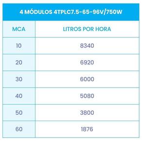 A bomba 4TPLC7.5-65-96V/750W pode chegar à 66.720 litros por dia de vazão e conta com um motor de imã permanente sem escovas, que não requer manutenção e um sistema de rampa de partida suave, que aumenta a vida útil do motor. Além da bomba ser toda construída em aço inox, possui um sensor de nível e um sistema de proteção contra funcionamento à seco, proporcionando muito mais segurança durante o seu funcionamento.