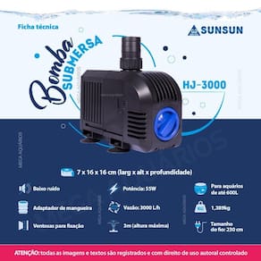 Especificações técnicas: Marca: Sunsun Modelo: HJ-3000 Potência: 55W Hmax: 3.0m altura máxima que a bomba consegue elevar a água Vazão: 3000 L/h Indicado para aquários de até 600L Medidas: 7 x 16 x 16cm larg x alt x profundidade Peso: 1,389kg Tamanho do fio: 230cm