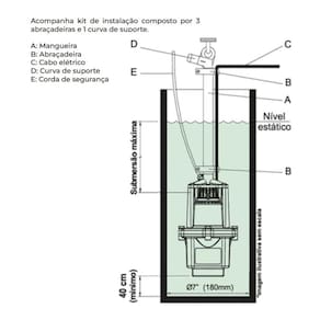 Bomba submersa vibratória para poço com diâmetro superior a 7 polegadas (180 mm). Possui potência de 360 Watts e elevação máxima de 65 metros. É projetada para atender às necessidades básicas de água em residências, indústrias, pequenas irrigações e criações de animais.